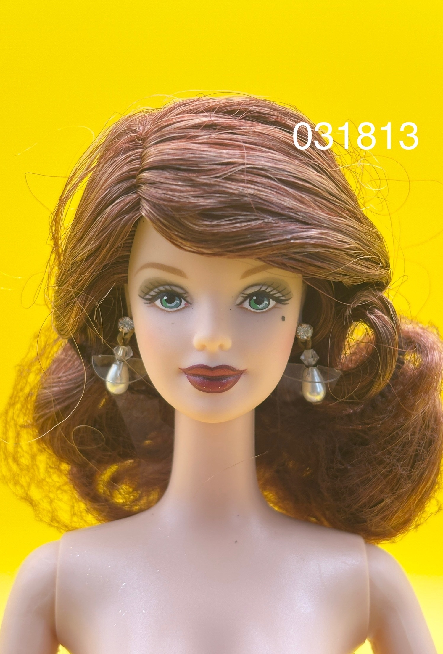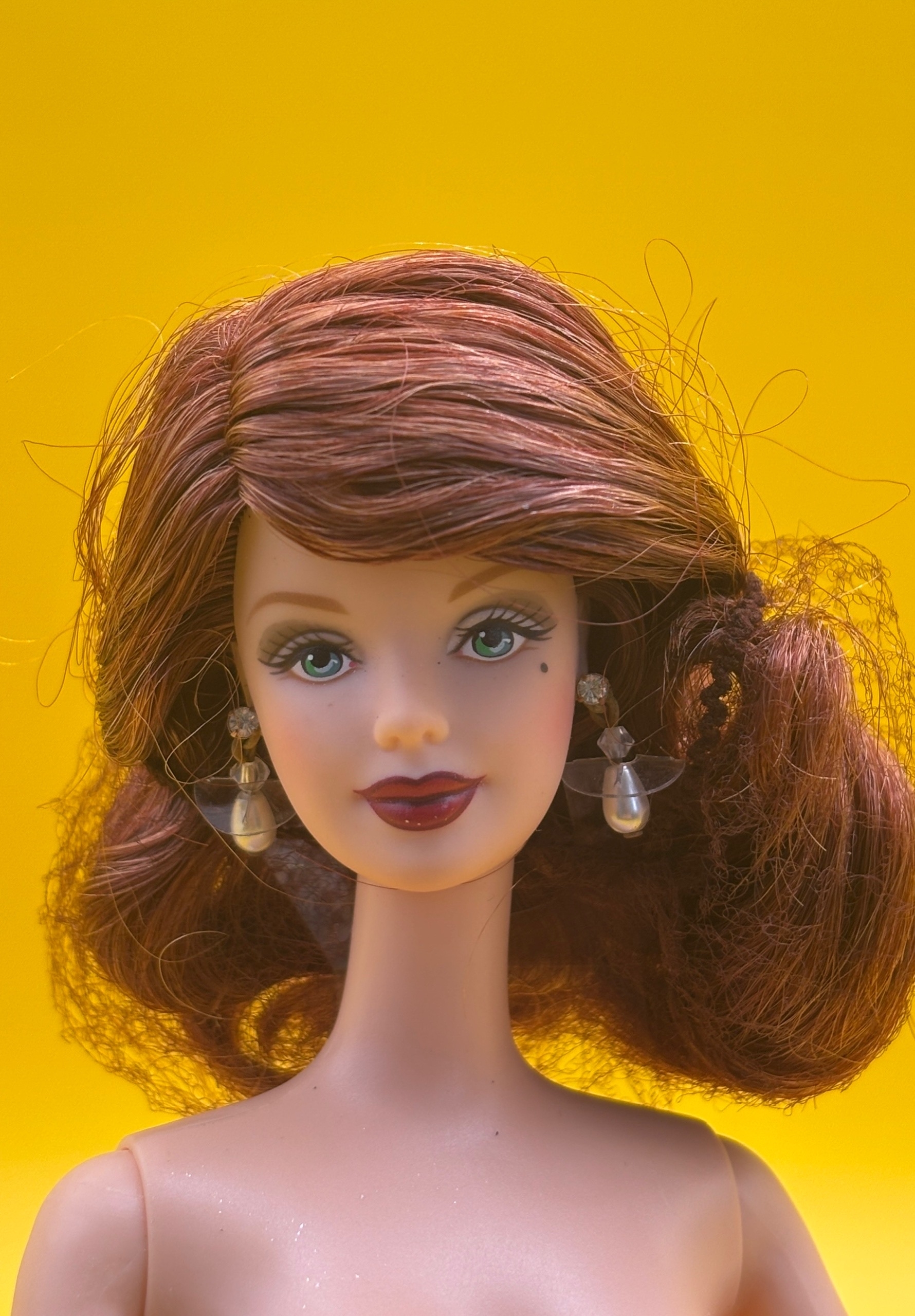 У куклы стройная фигурка, голубые глаза, красно-каштановые волосы, спадающие на плечи мягкими локонами, и яркая помада на губах.