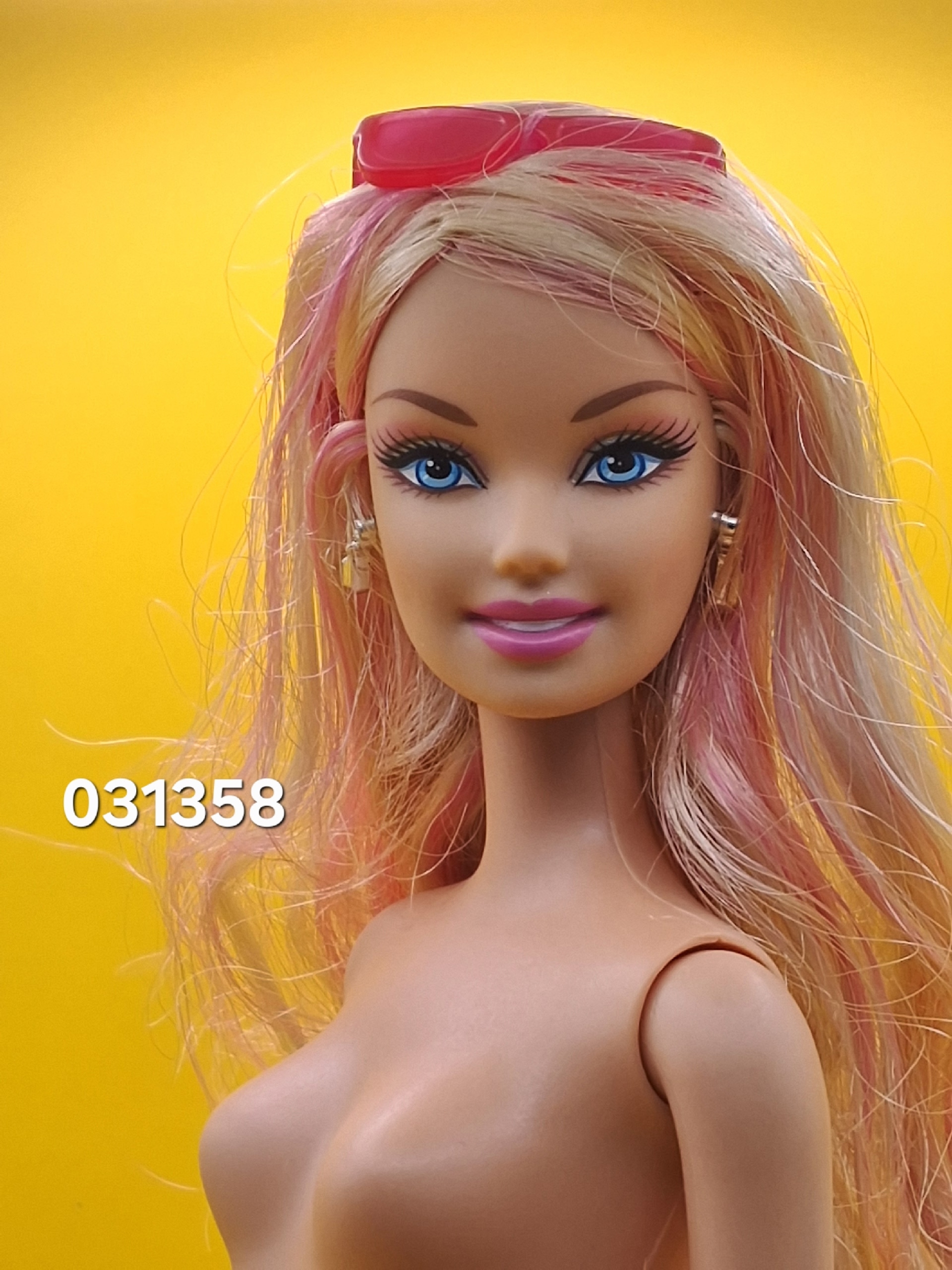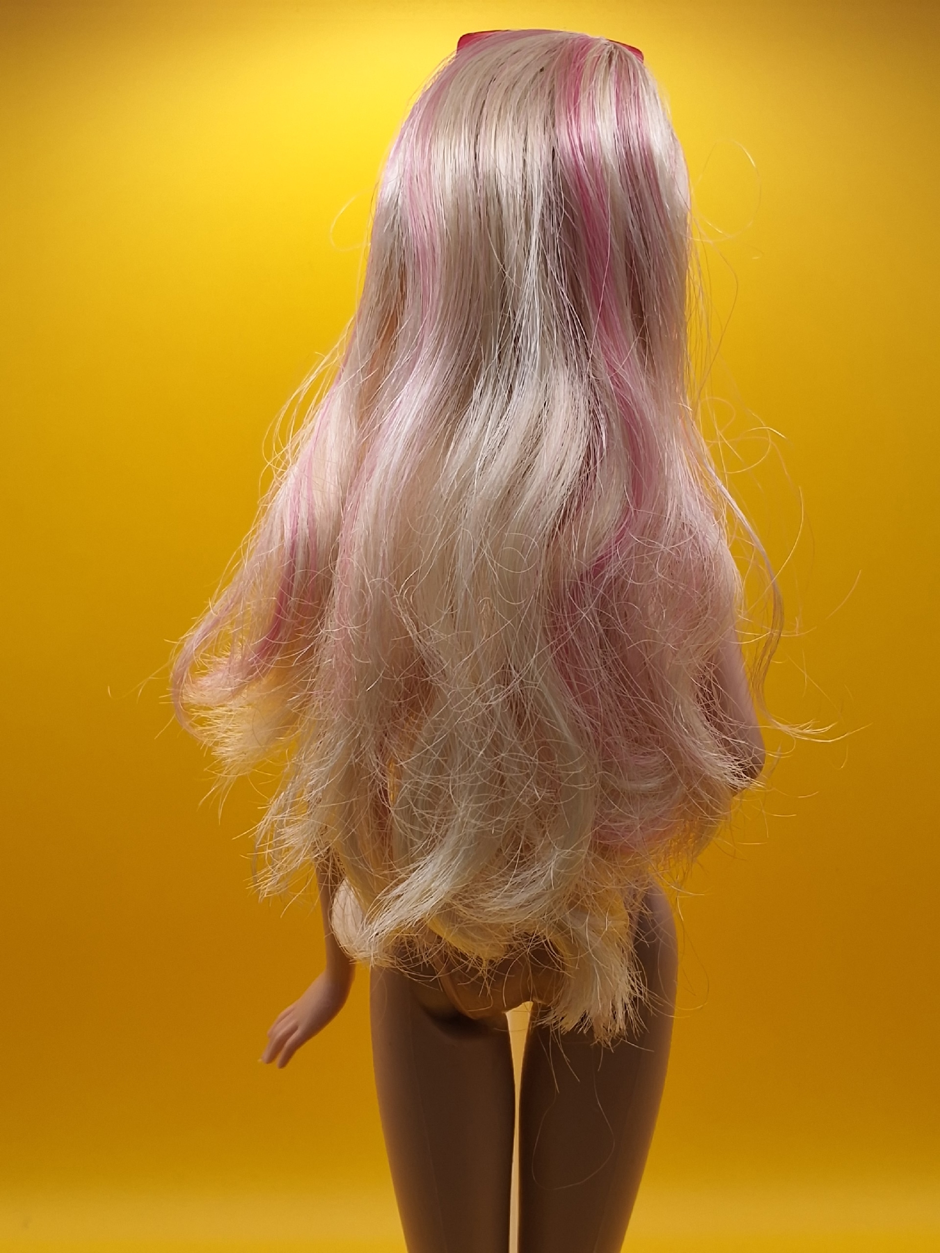 Волосы: светлые, уложены в аккуратные косички. Есть несколько пустых лунок по голове — незначительный дефект, который практически не заметен. Возможно лёгкое окрашивание у пробора, что придаёт кукле особый шарм.