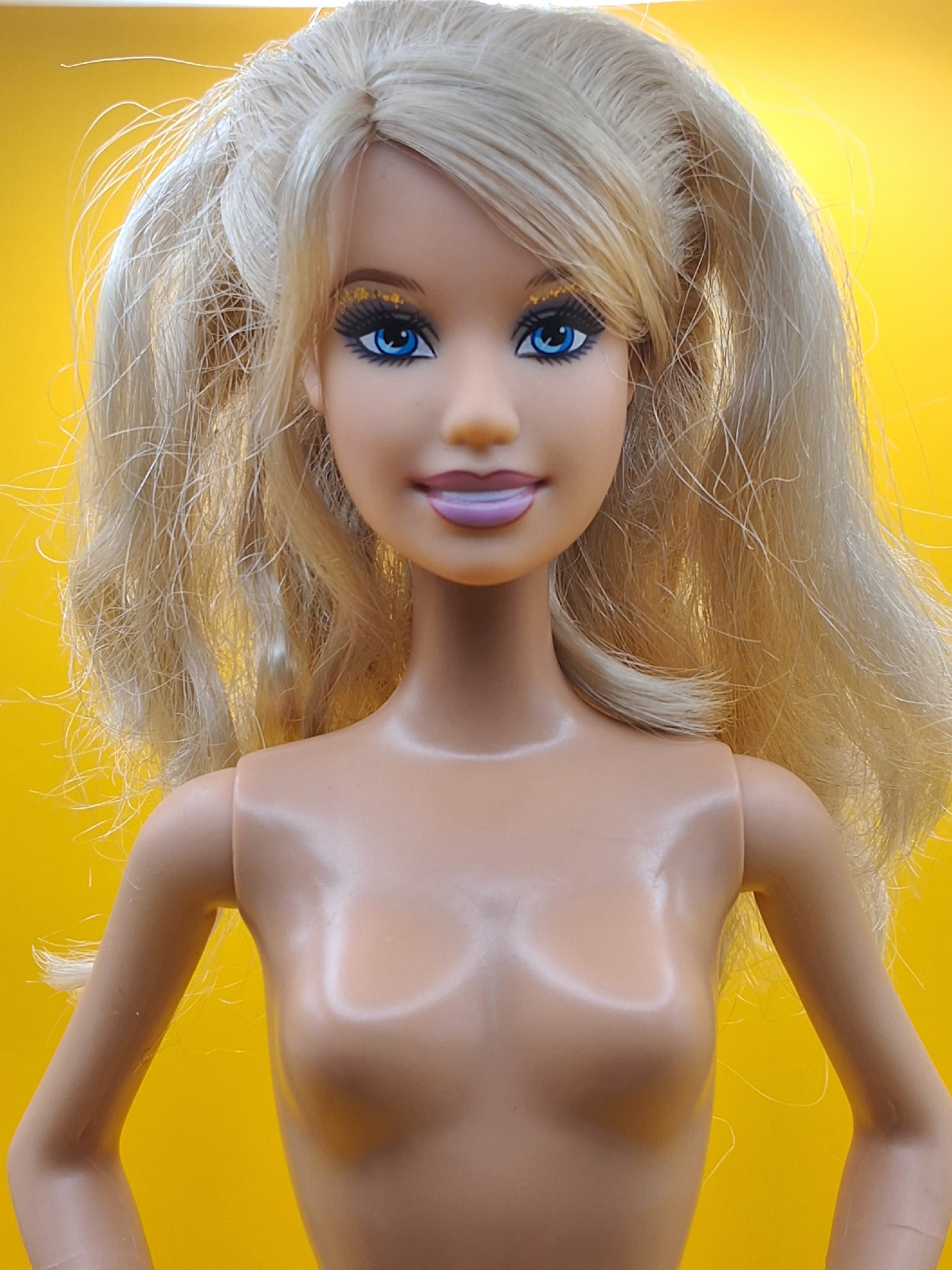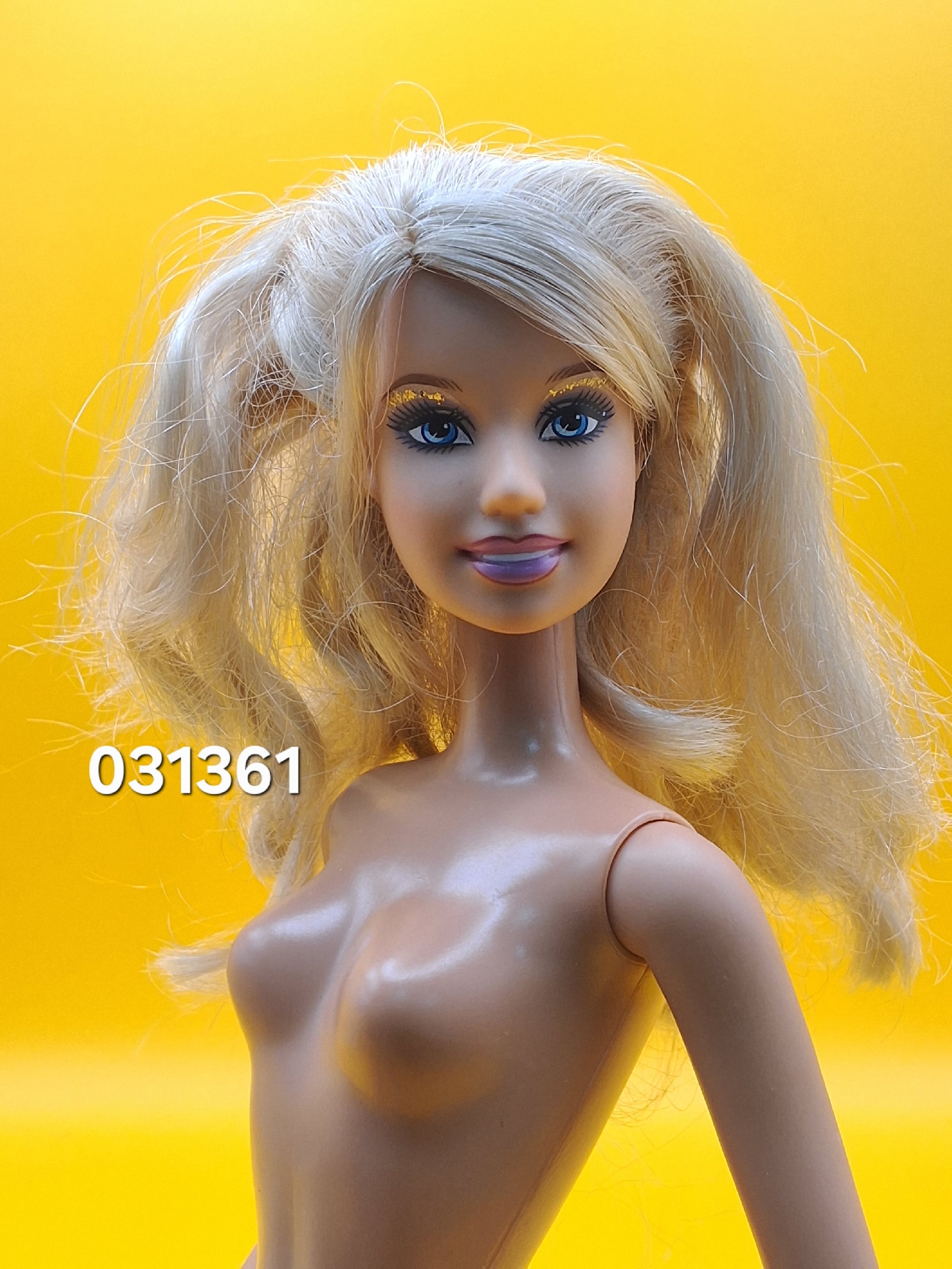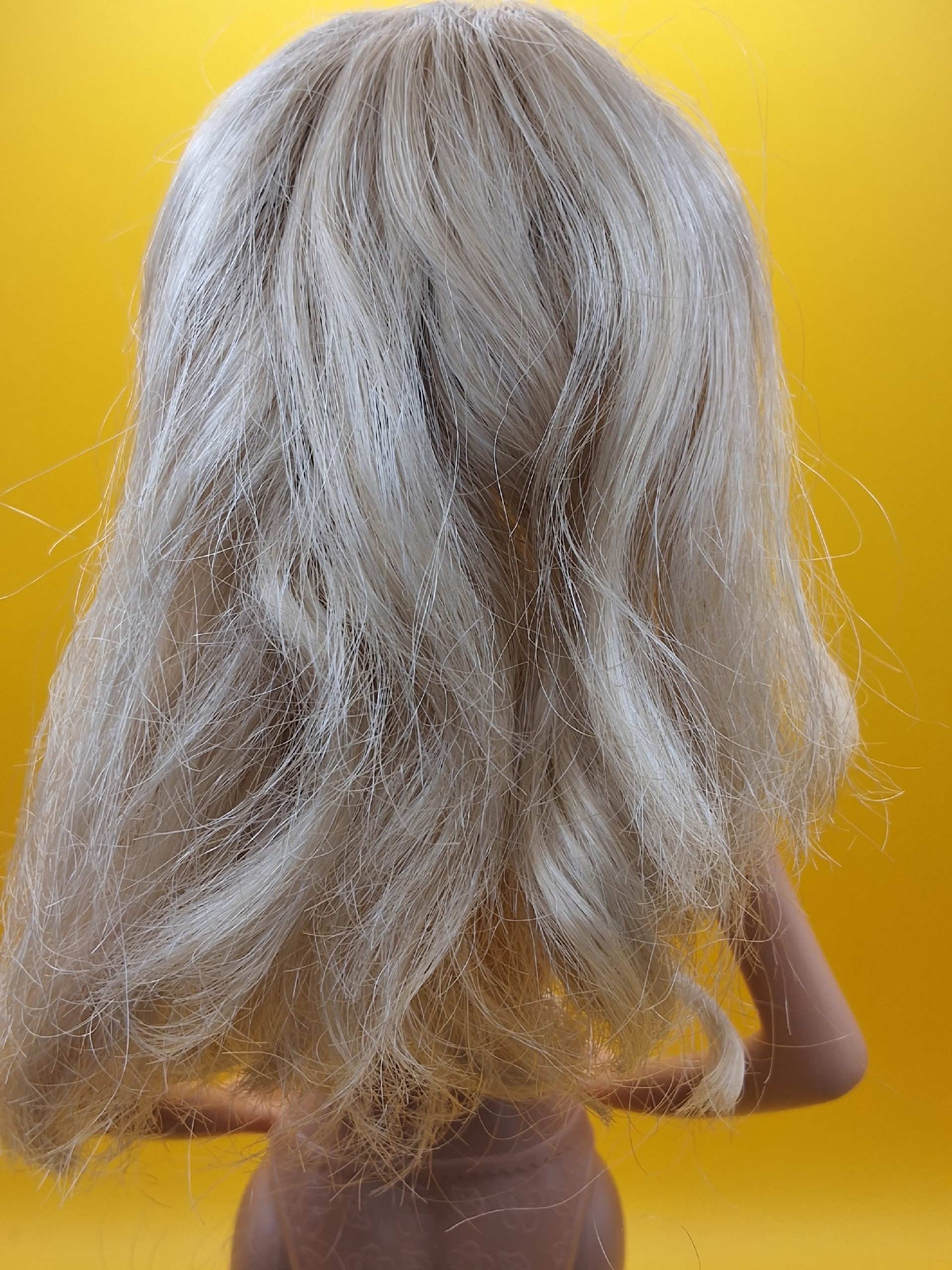 Волосы: светлые, уложены в аккуратные косички. Есть несколько пустых лунок по голове — незначительный дефект, который практически не заметен. Возможно лёгкое окрашивание у пробора, что придаёт кукле особый шарм.