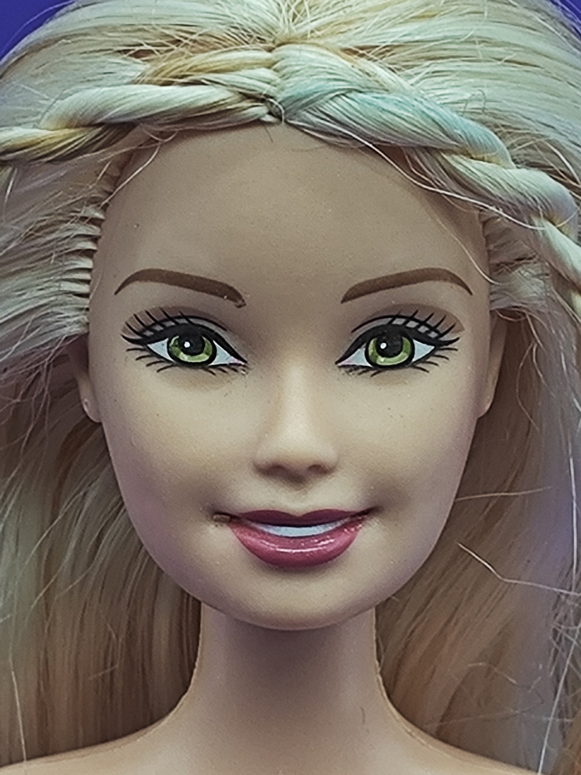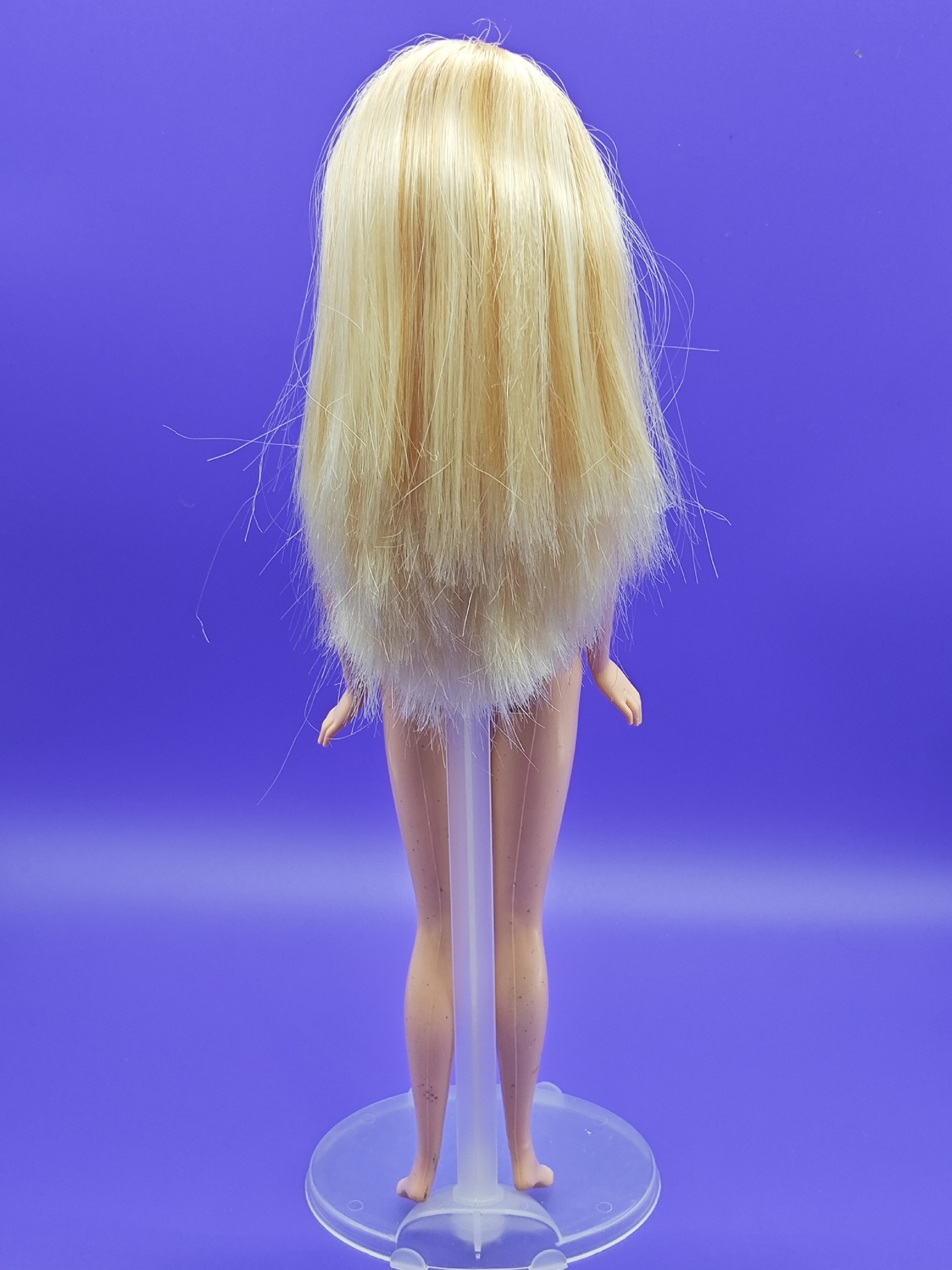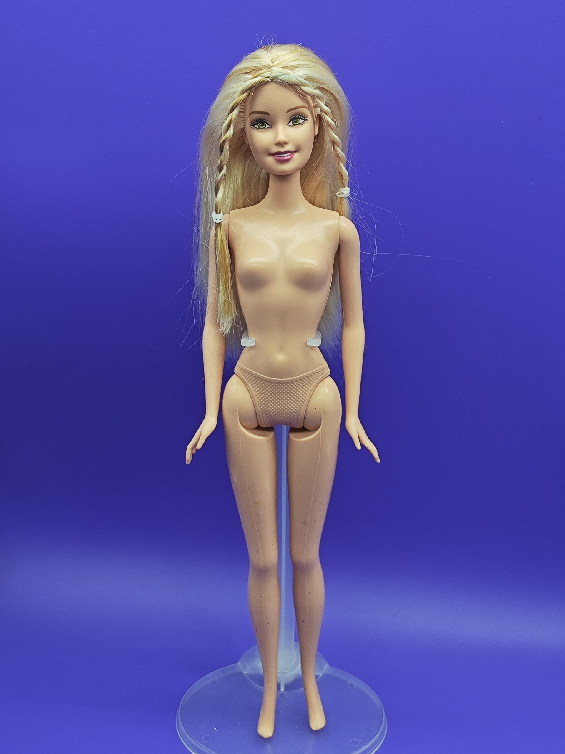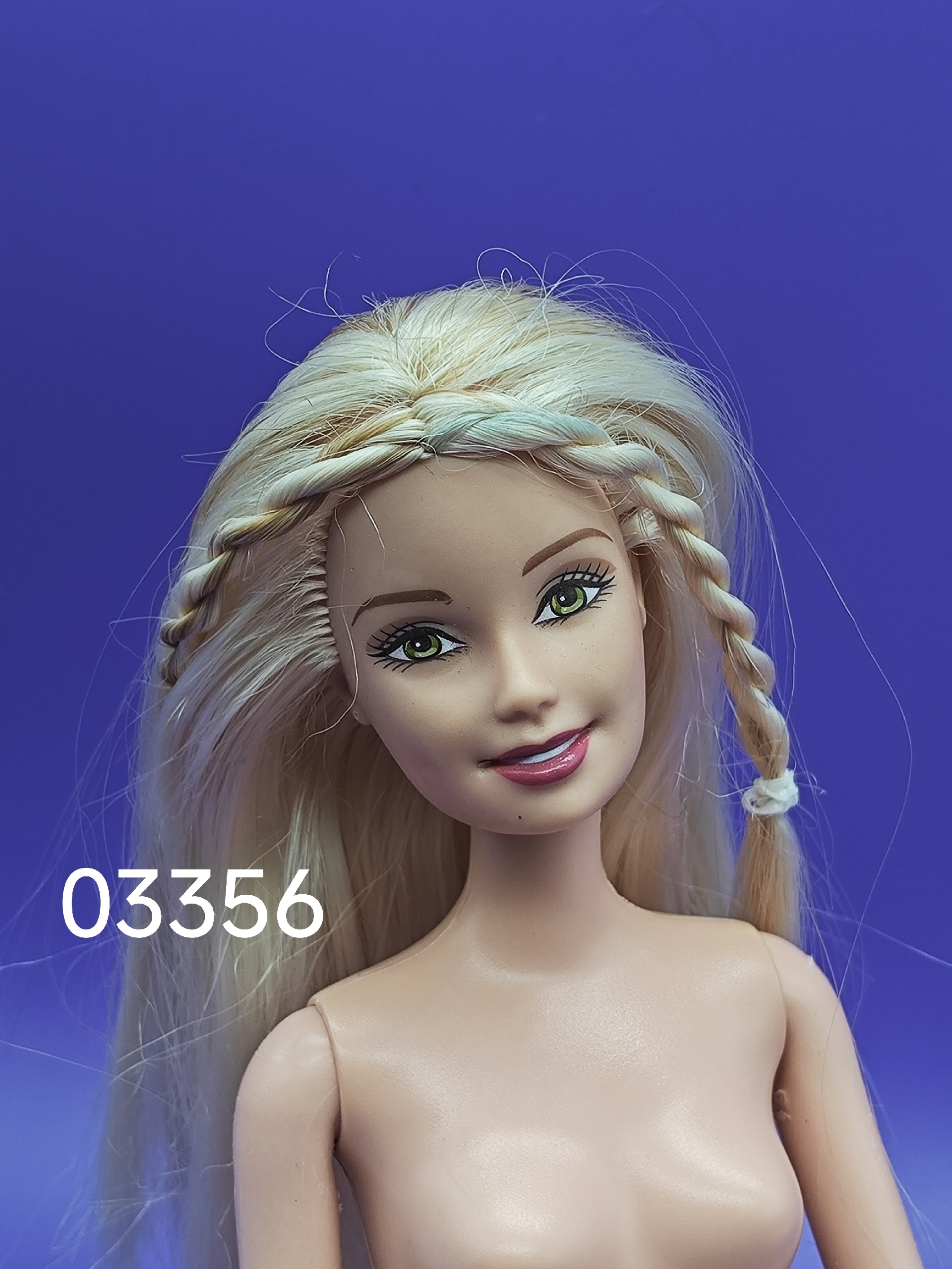 Волосы: светлые, уложены в аккуратные косички. Есть несколько пустых лунок по голове — незначительный дефект, который практически не заметен. Возможно лёгкое окрашивание у пробора, что придаёт кукле особый шарм.