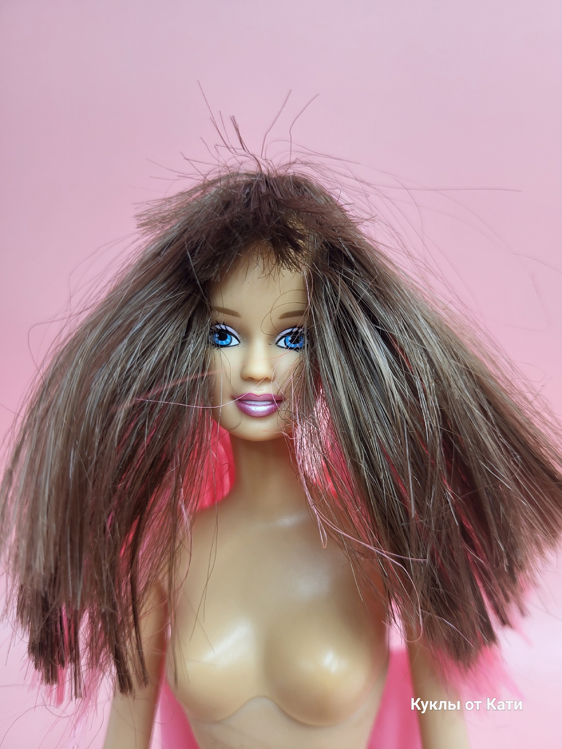 Волосы: двухцветные, густые, в хорошем состоянии. Требуется чистка и укладка для идеального вида. Механизм причёски работает — можно менять стиль!