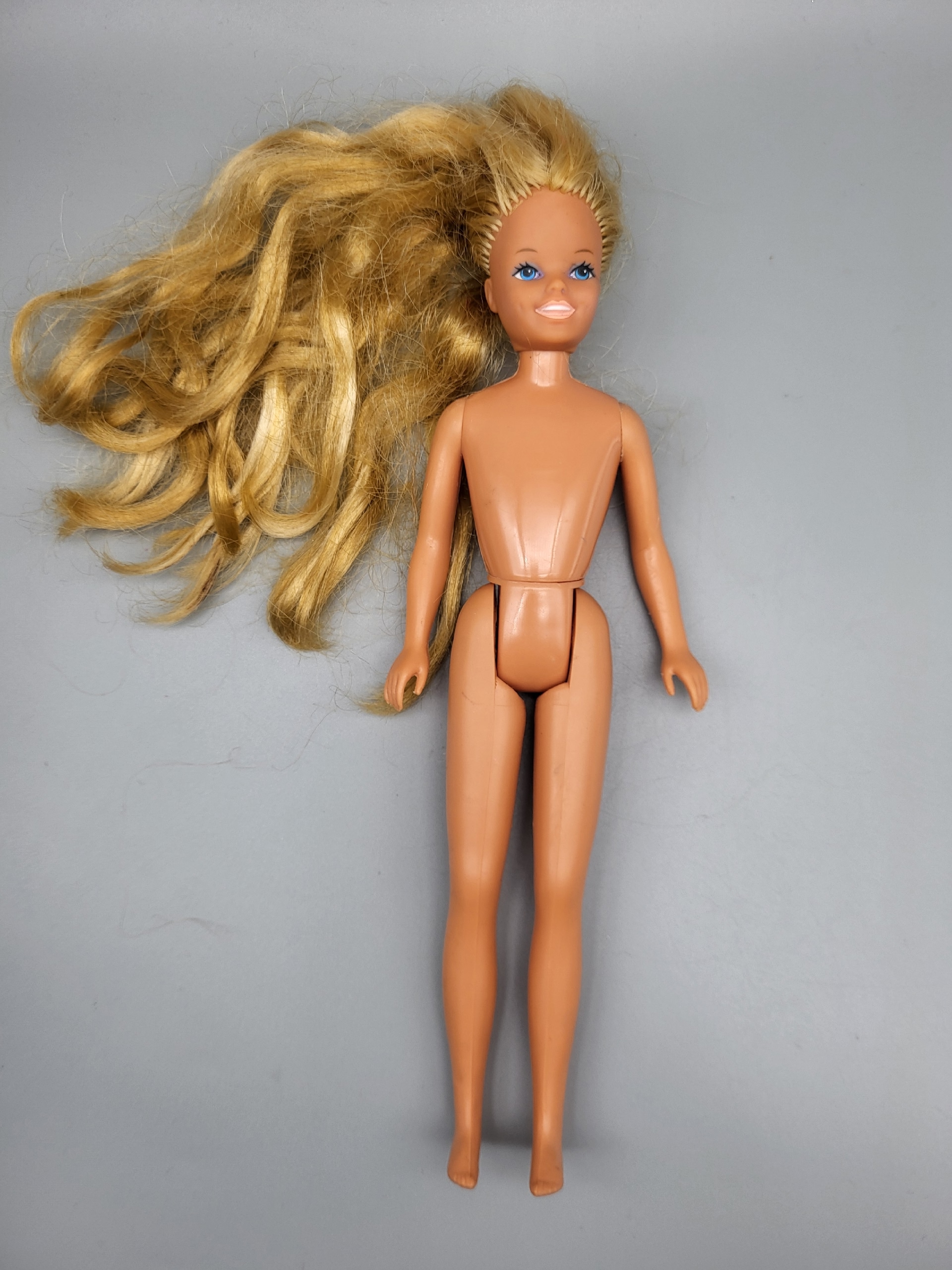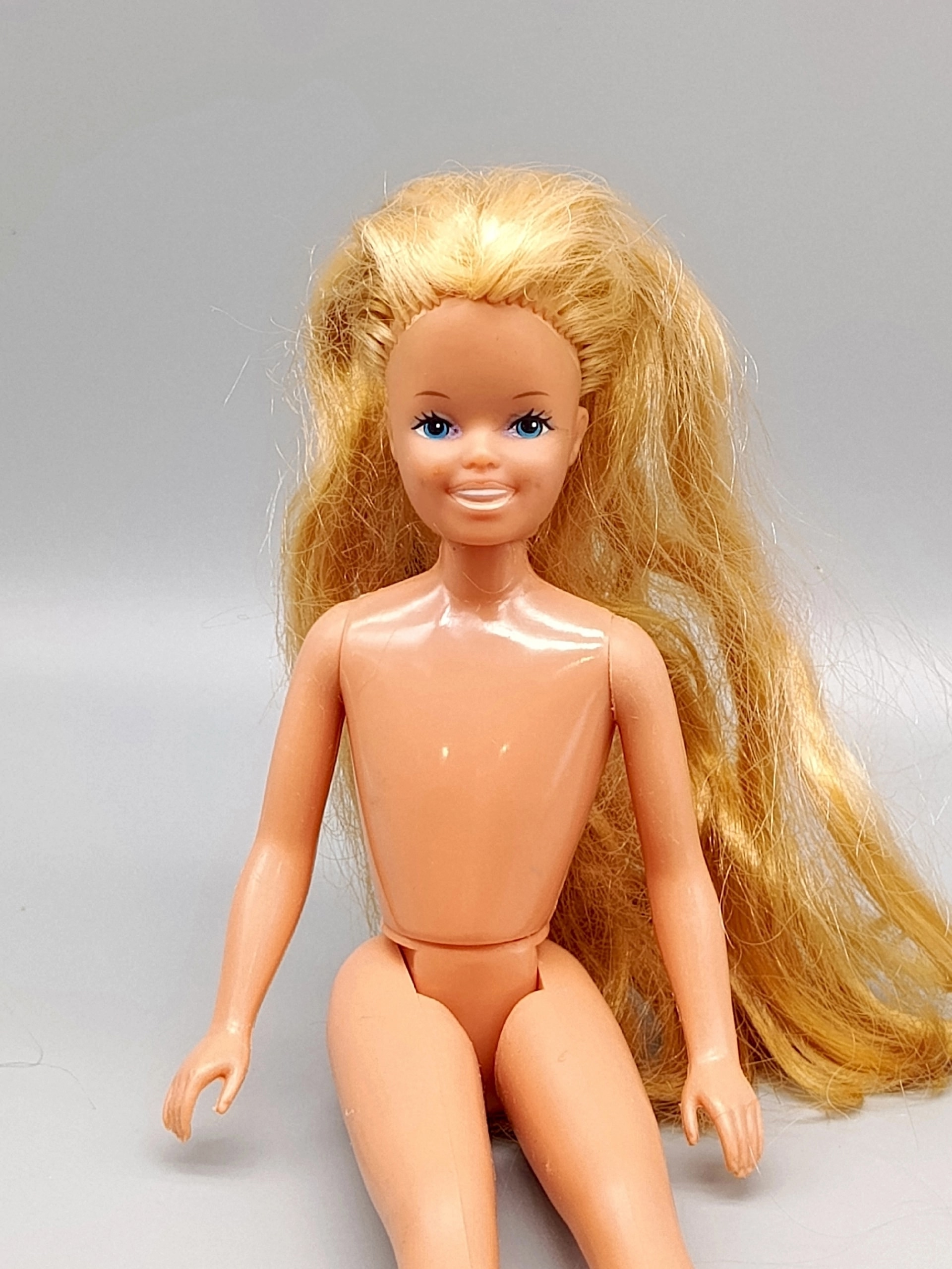 Тело: стандартное для кукол того периода, без шарниров, но с возможностью сгибать ноги (обычно на 2 щёлчка).