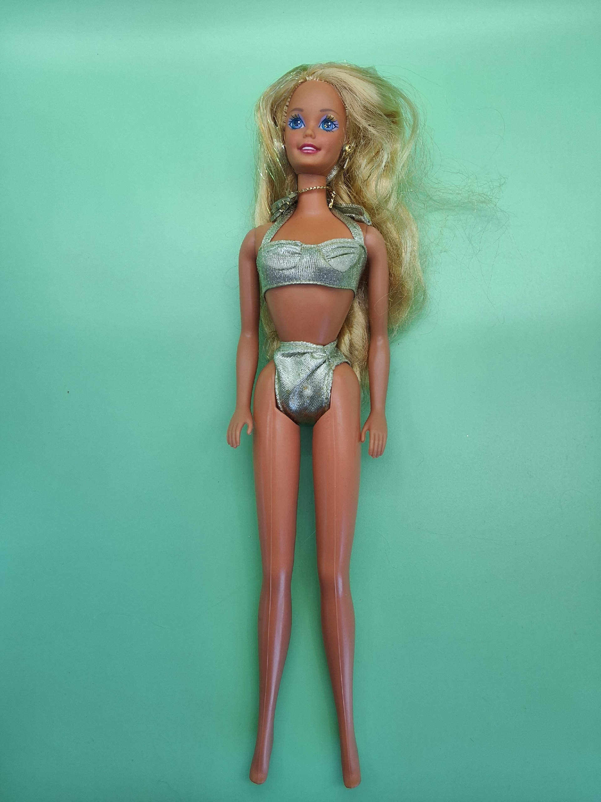 Познакомьтесь с Barbie Sun Sensation — куклой из 1991 года, которая словно сохранила в себе тепло солнечных дней начала 90‑х. Эта красавица родом из Малайзии — настоящий кусочек детства и винтажного очарования! Её стильный золотой купальник сразу напоминает о лете и пляжном отдыхе — именно так выглядела оригинальная версия из серии Sun Sensation.
