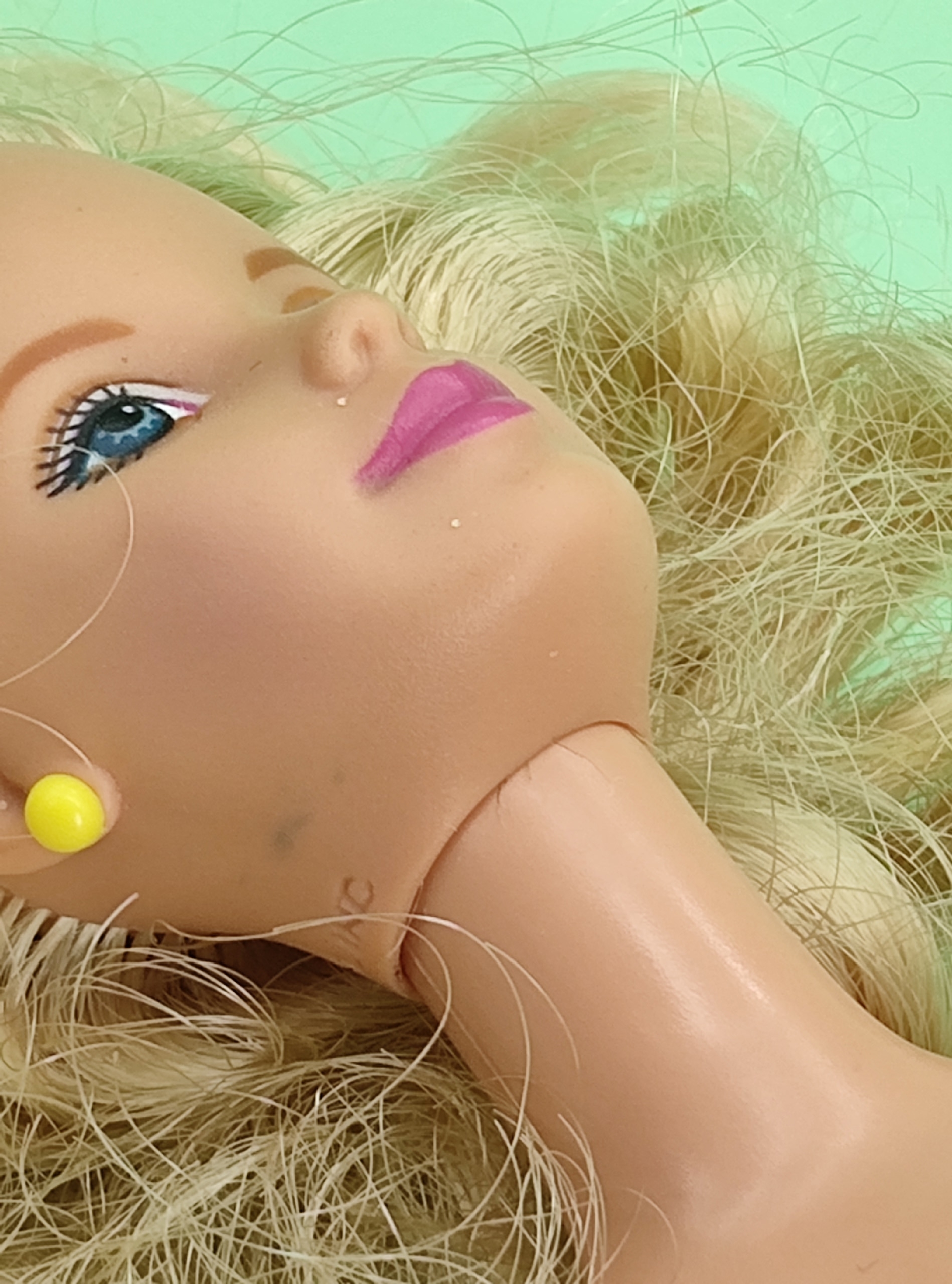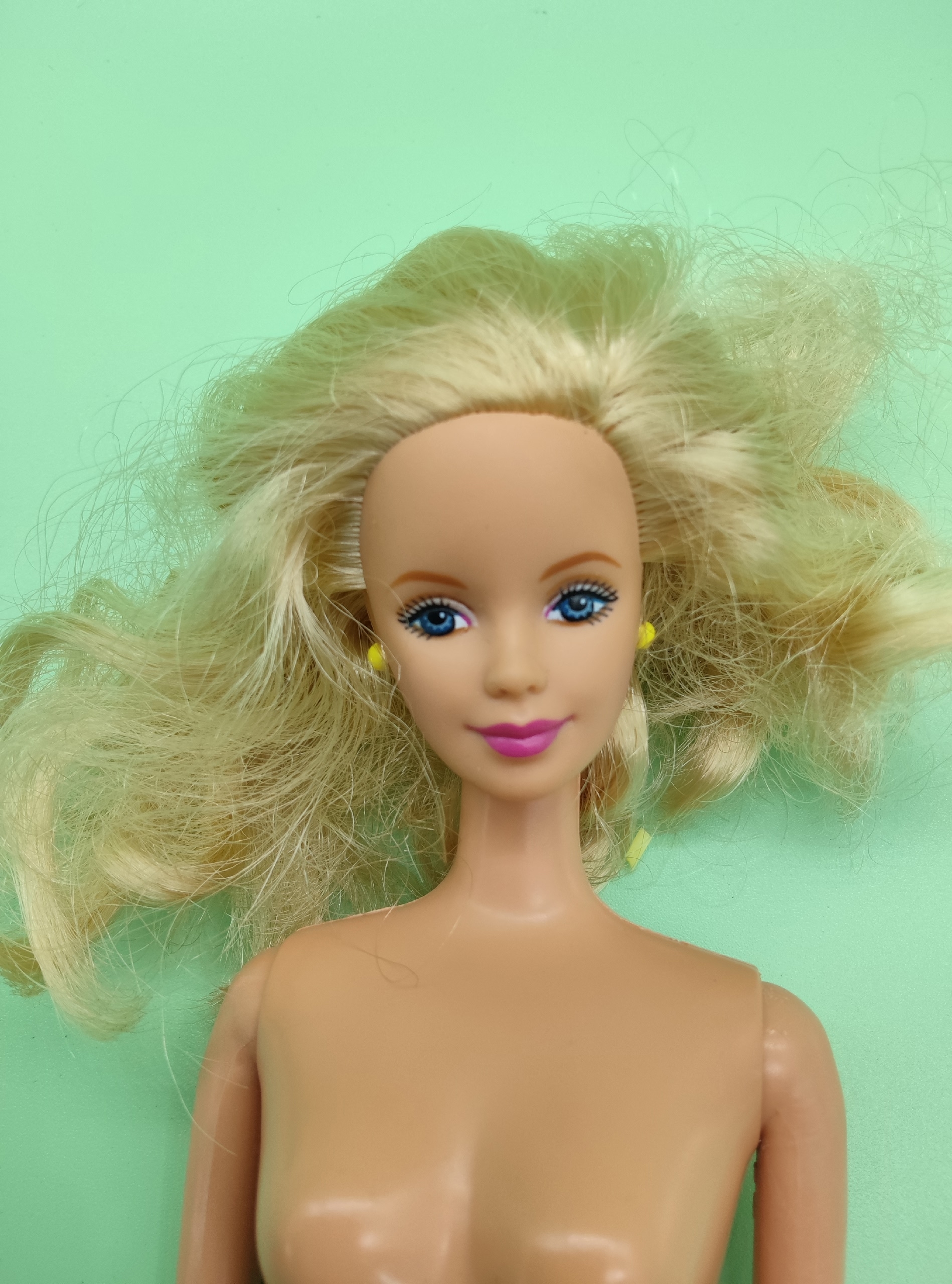Лицо и макияж: макияж в хорошем состоянии, без потёртостей и повреждений, черты лица чёткие.есть пятнышко на щеке. Необходима чистка