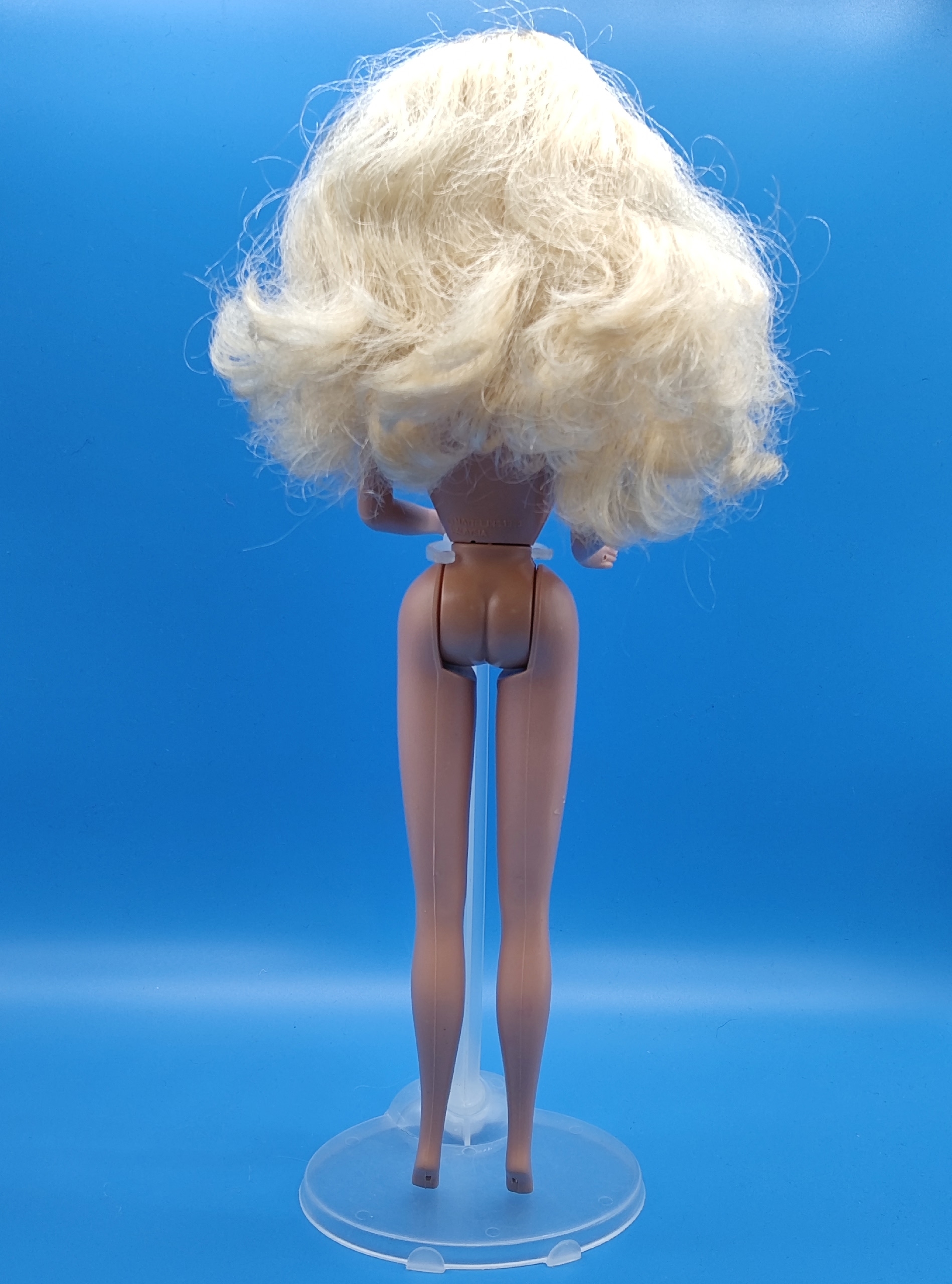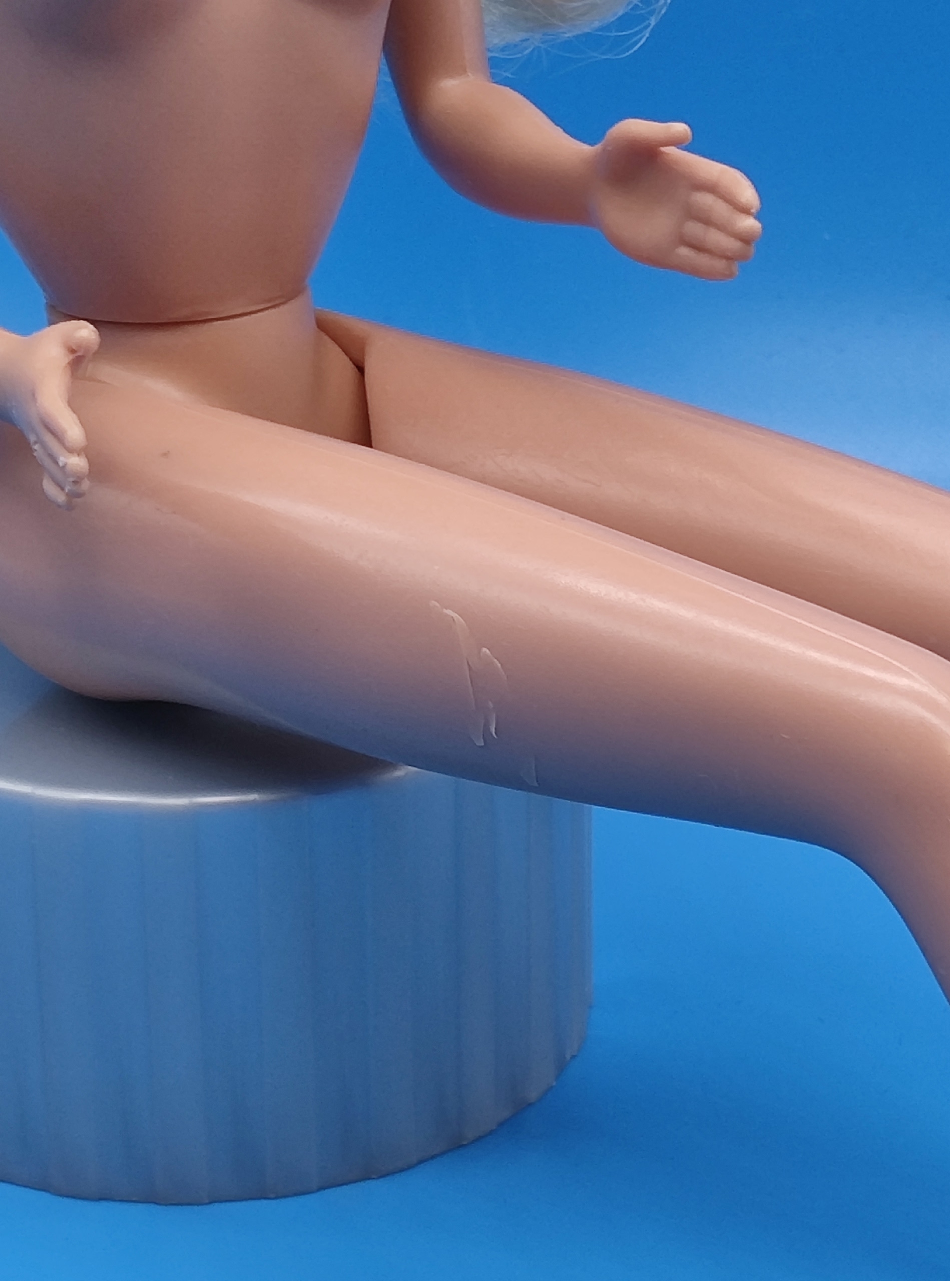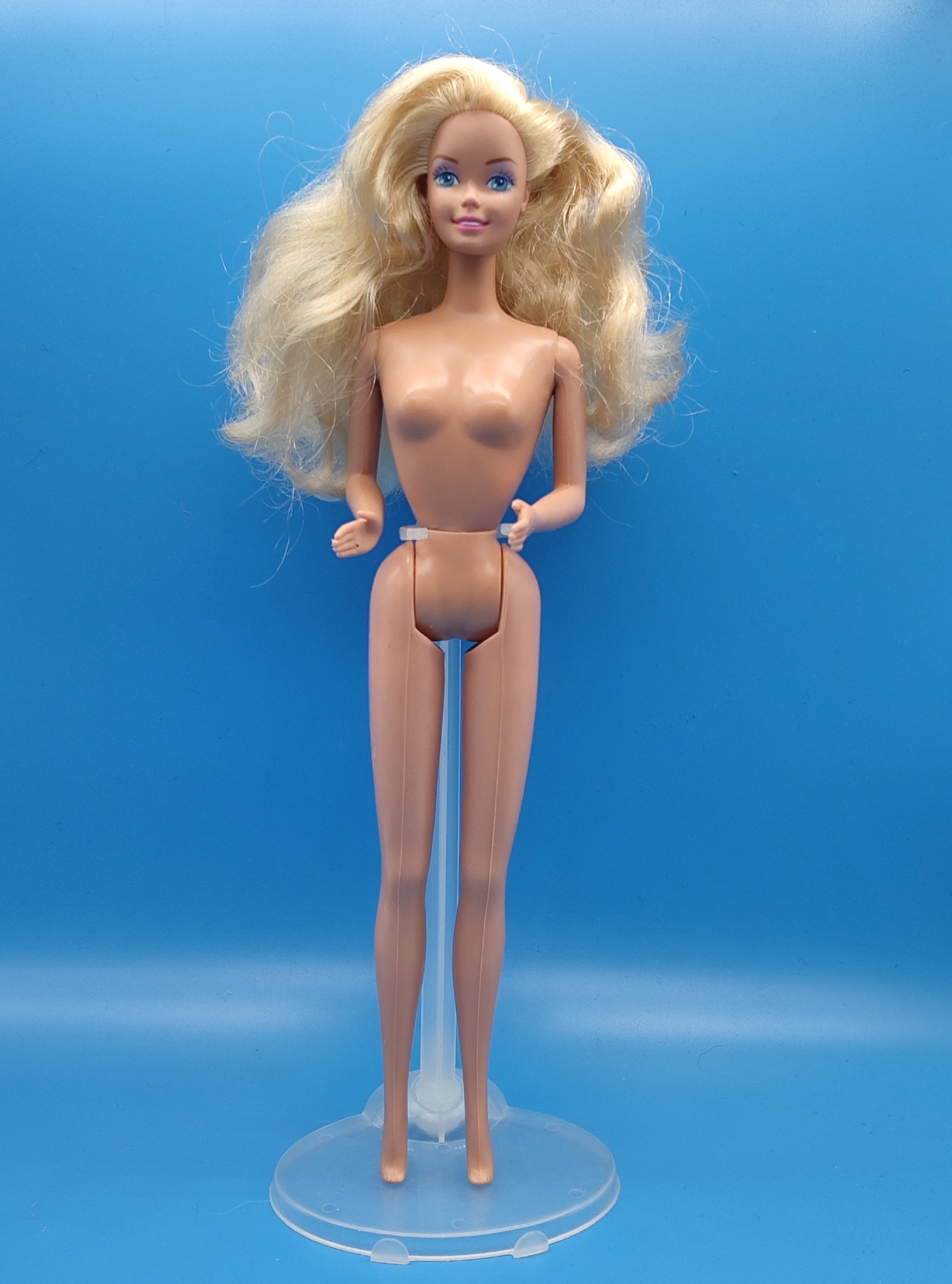 Тело. У кукол 1990-х была узкая и скошённая поворотная талия — это ключевой признак «девяностых» Барби. Чаще всего тело было тяжёлым, с резиновыми ножками, которые сгибались на два щелчка (коленные суставы ступенчато гнулись в несколько этапов). Руки обычно были пластиковыми, разводящимися в стороны. Иногда присутствовал поясной шарнир.
