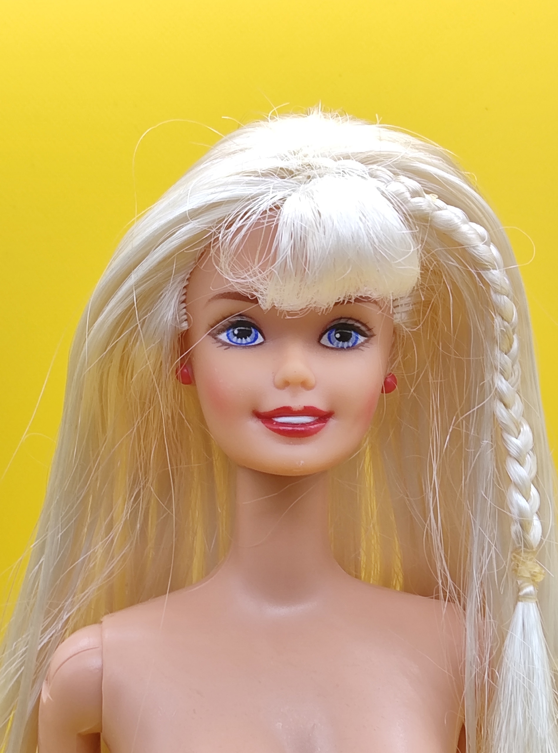 Винтажная кукла Барби (производство — Китай). В комплекте красные серьги и кольцо. Состояние: частично сохранилась заводская причёска, требуется чистка и укладка волос. Подвижность: ноги гнутся на 2 щелчка, шея в хорошем состоянии. Мейк очень яркий, есть небольшая стертость краски на губах.