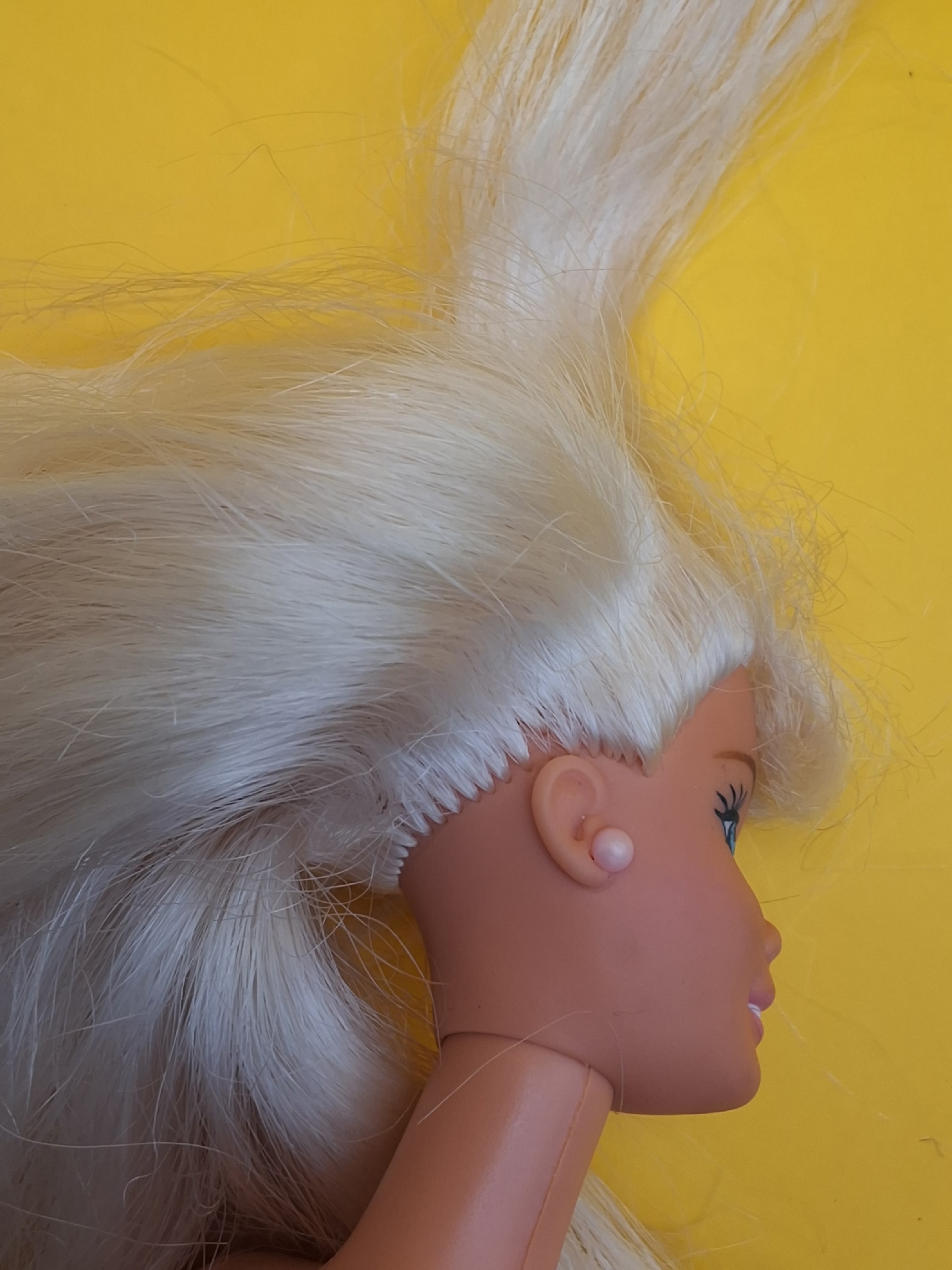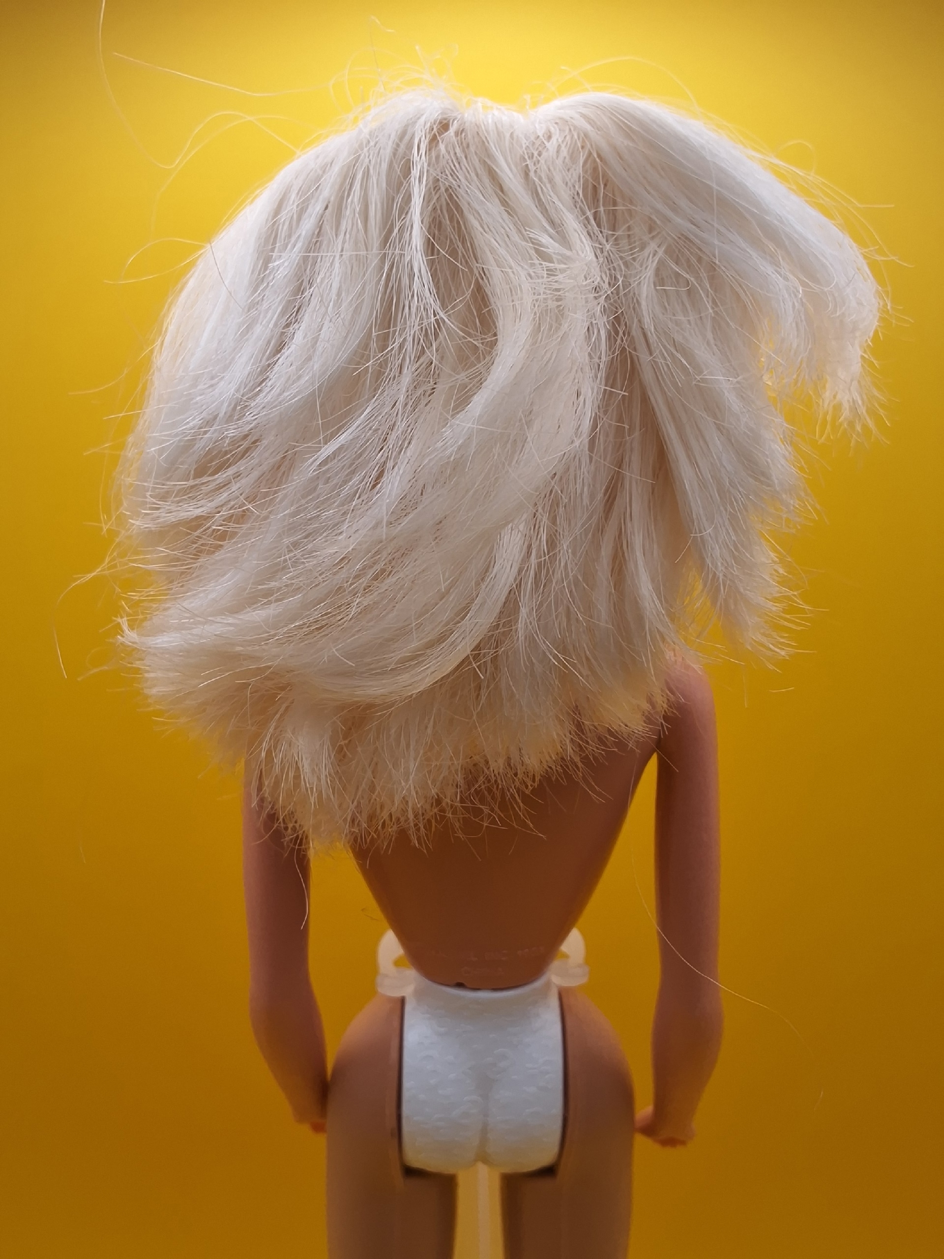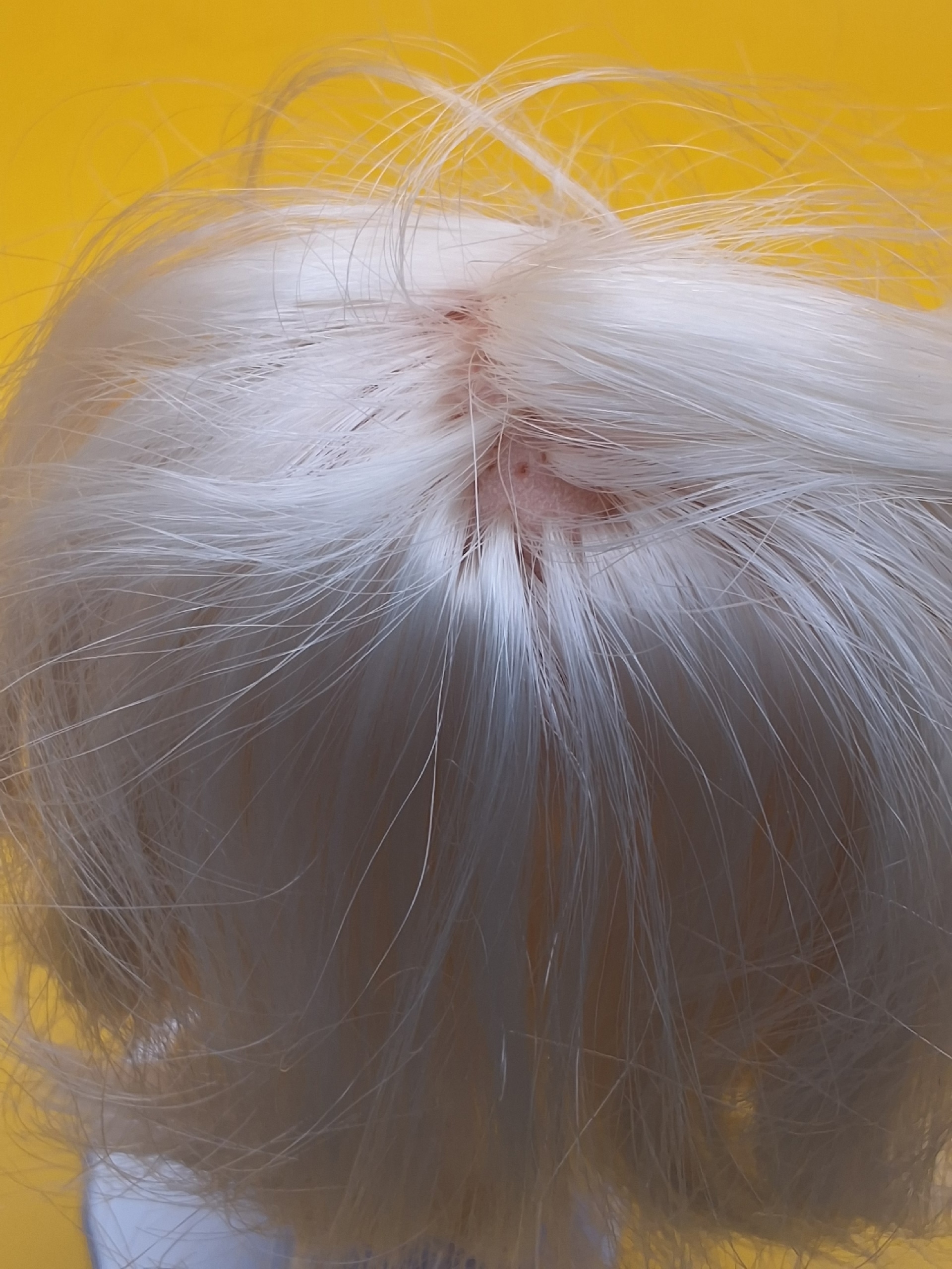 Волосы. Светлые, с лунками (пустотами в местах, где раньше были пряди). Требуют расчёсывания и укладки.