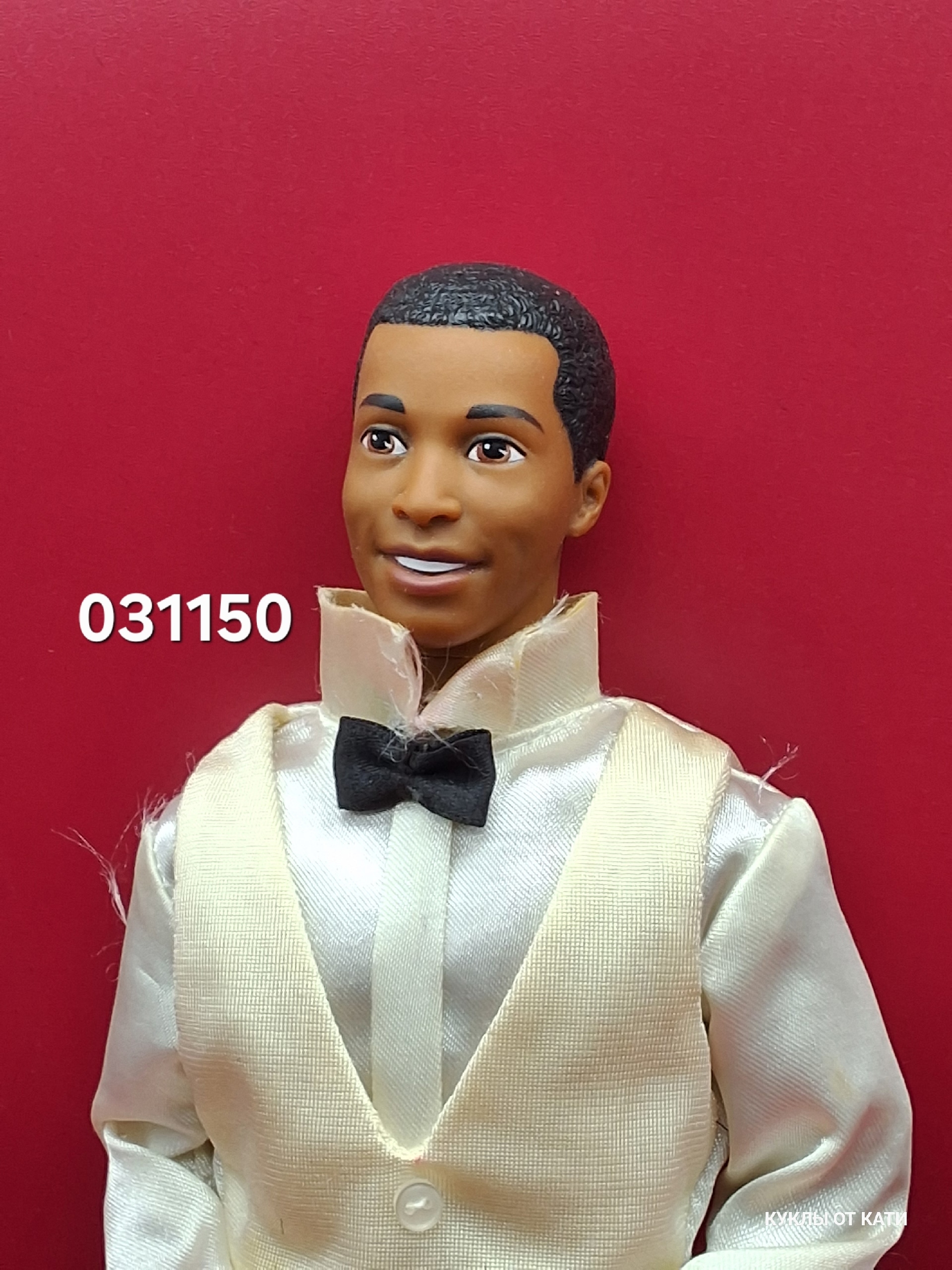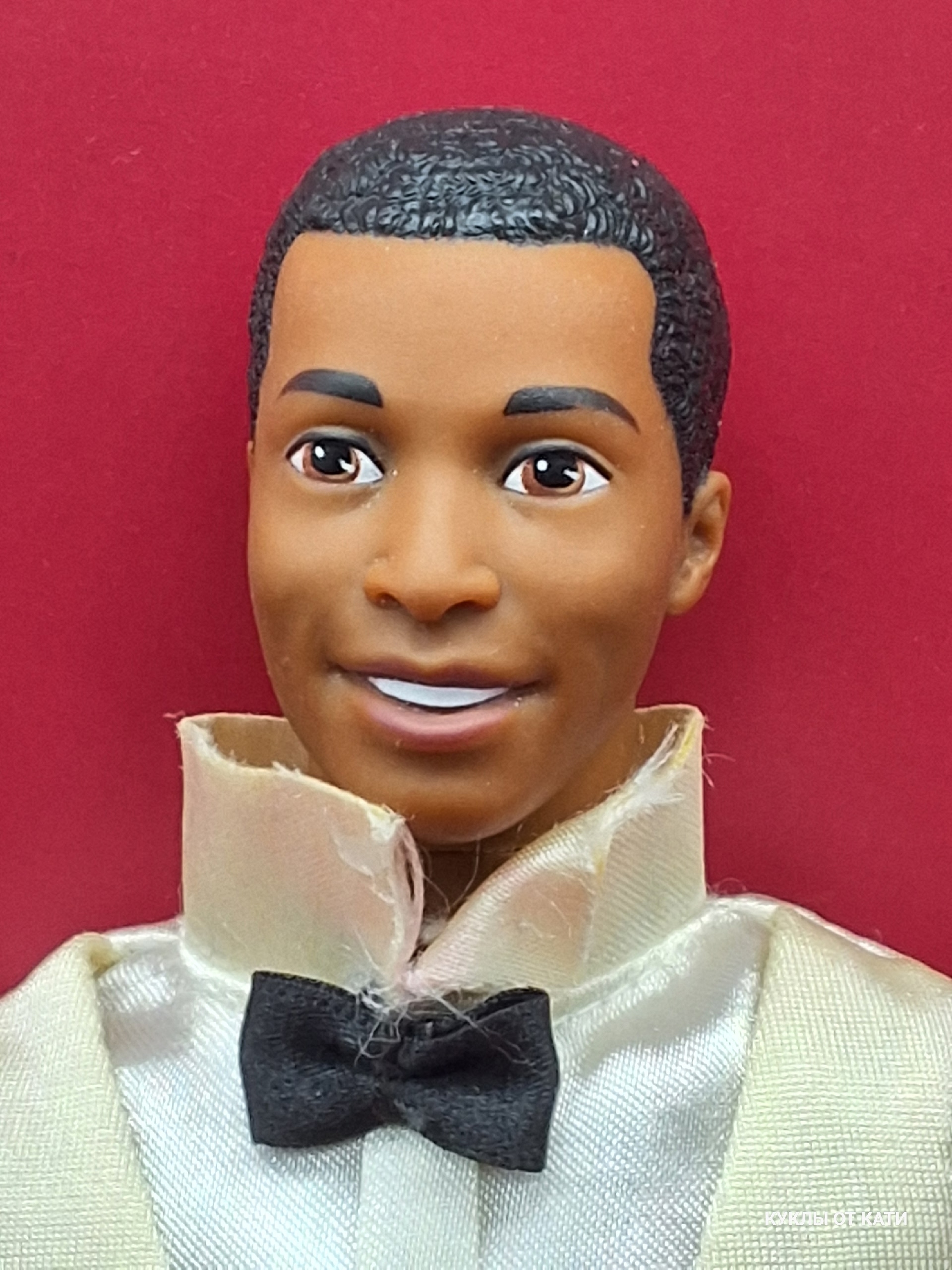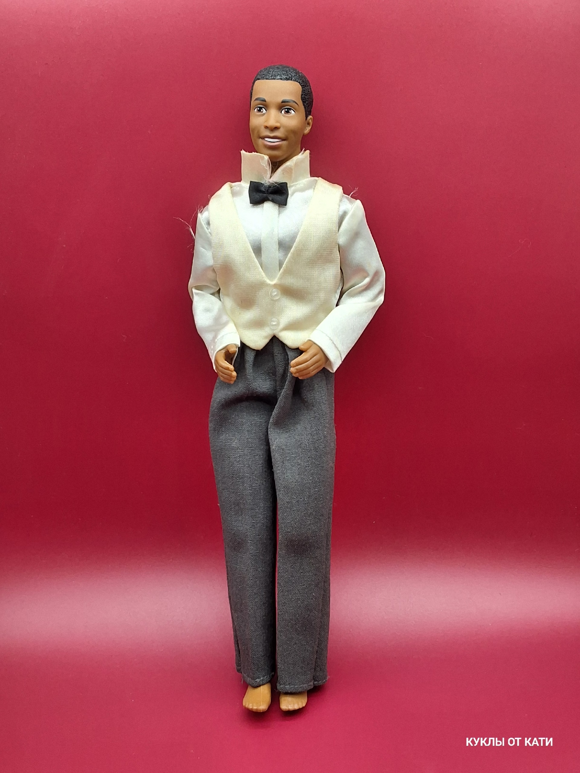Кен в вечернем костюме — словно герой романтической истории из 90-х. Его образ дышит благородством и шармом: белоснежная рубашка, нежный кремовый жилет, строгая чёрная бабочка. Серые брюки подчёркивают его статность. Он выглядит так, будто ждёт важного события — может быть, встречи с любимой или торжественного танца под звёздным небом. Его улыбка хранит тайну, а поза говорит о внутренней силе и доброте.