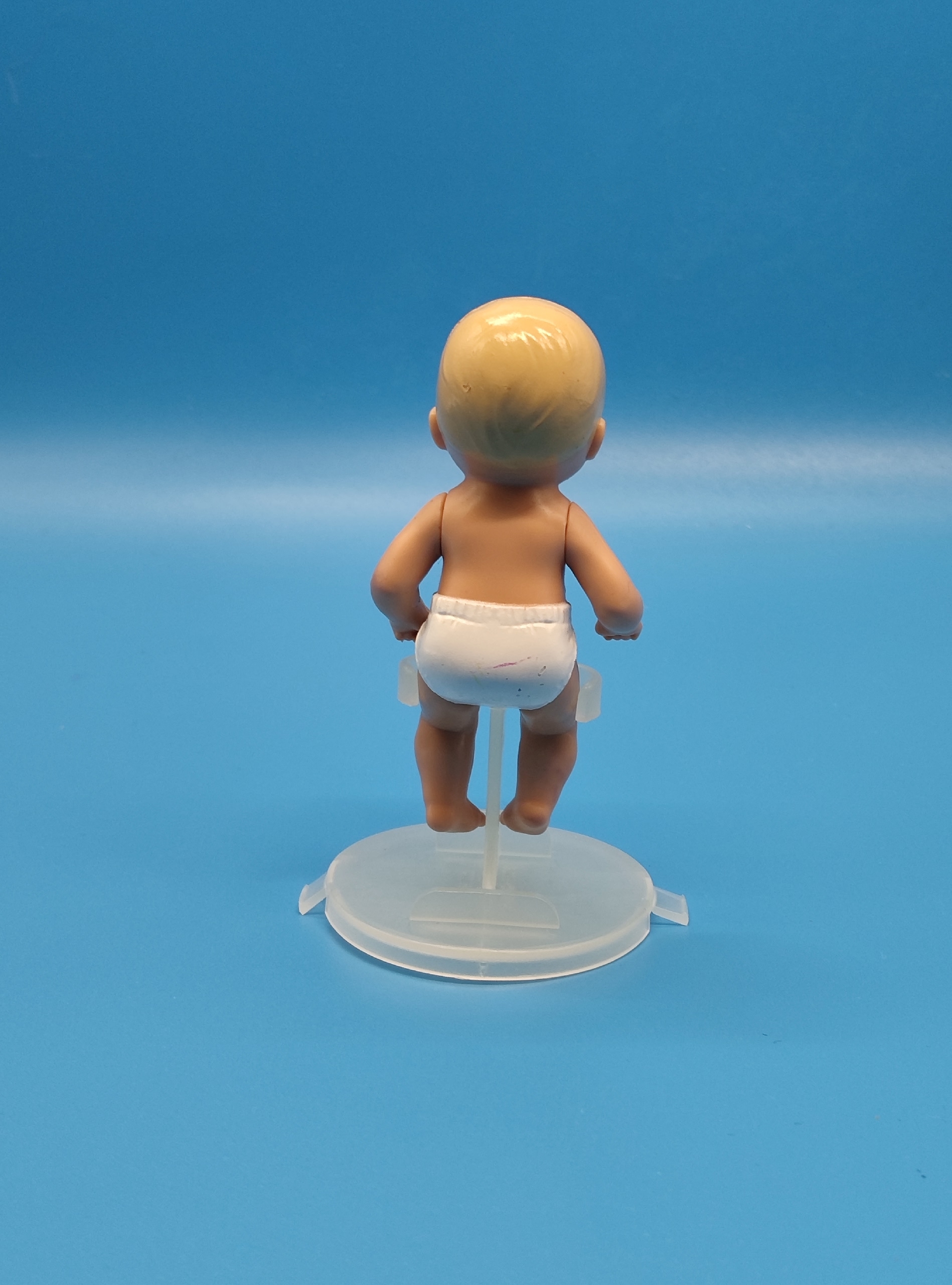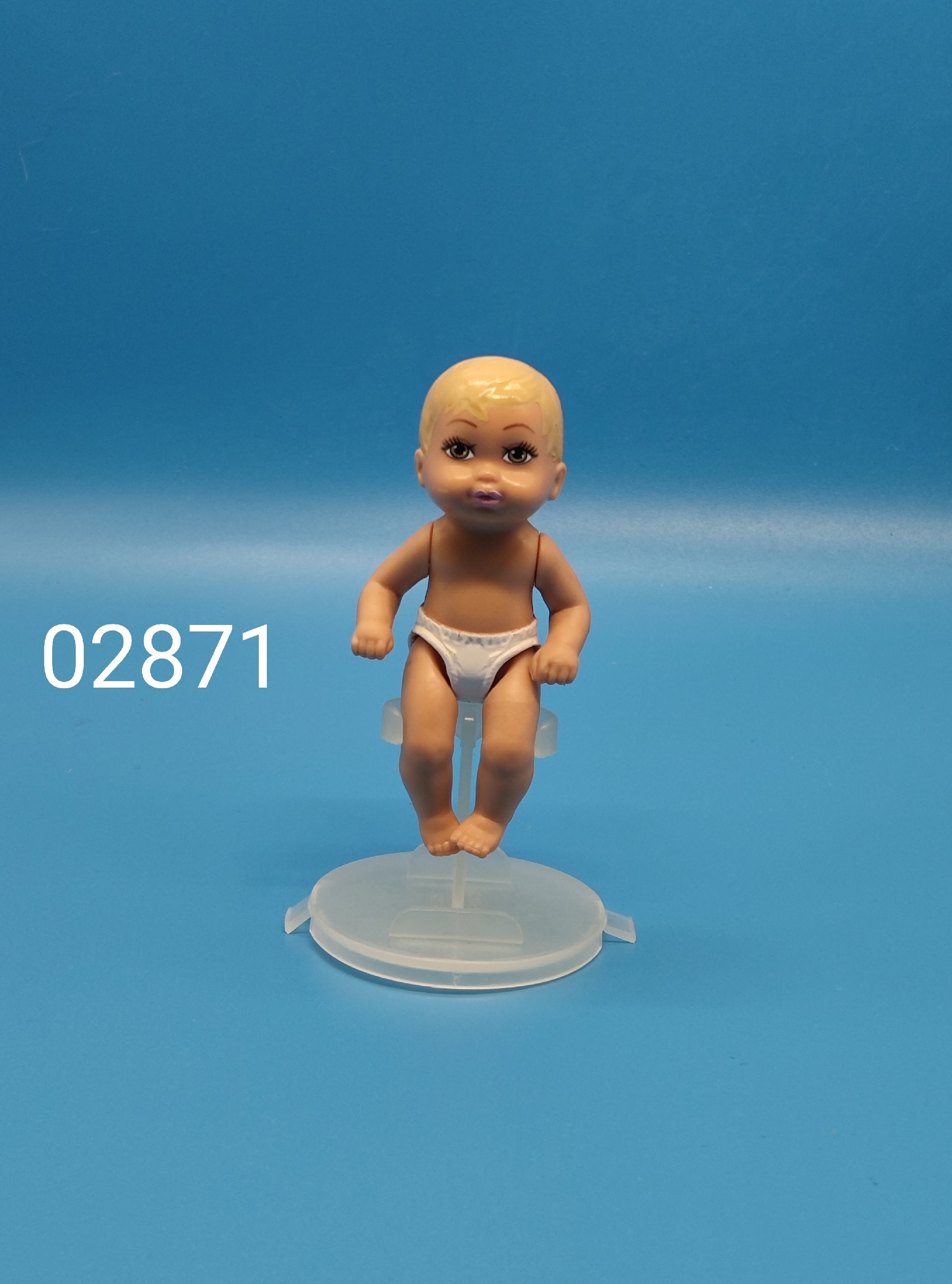 Эта миниатюрная малышка покоряет с первого взгляда: нежные черты лица, выразительные орехово‑коричневые глаза и мягкие светлые волосы создают невероятно трогательный образ. Кукла выполнена с высокой детализацией, характерной для коллекционных выпусков начала 2000‑х.