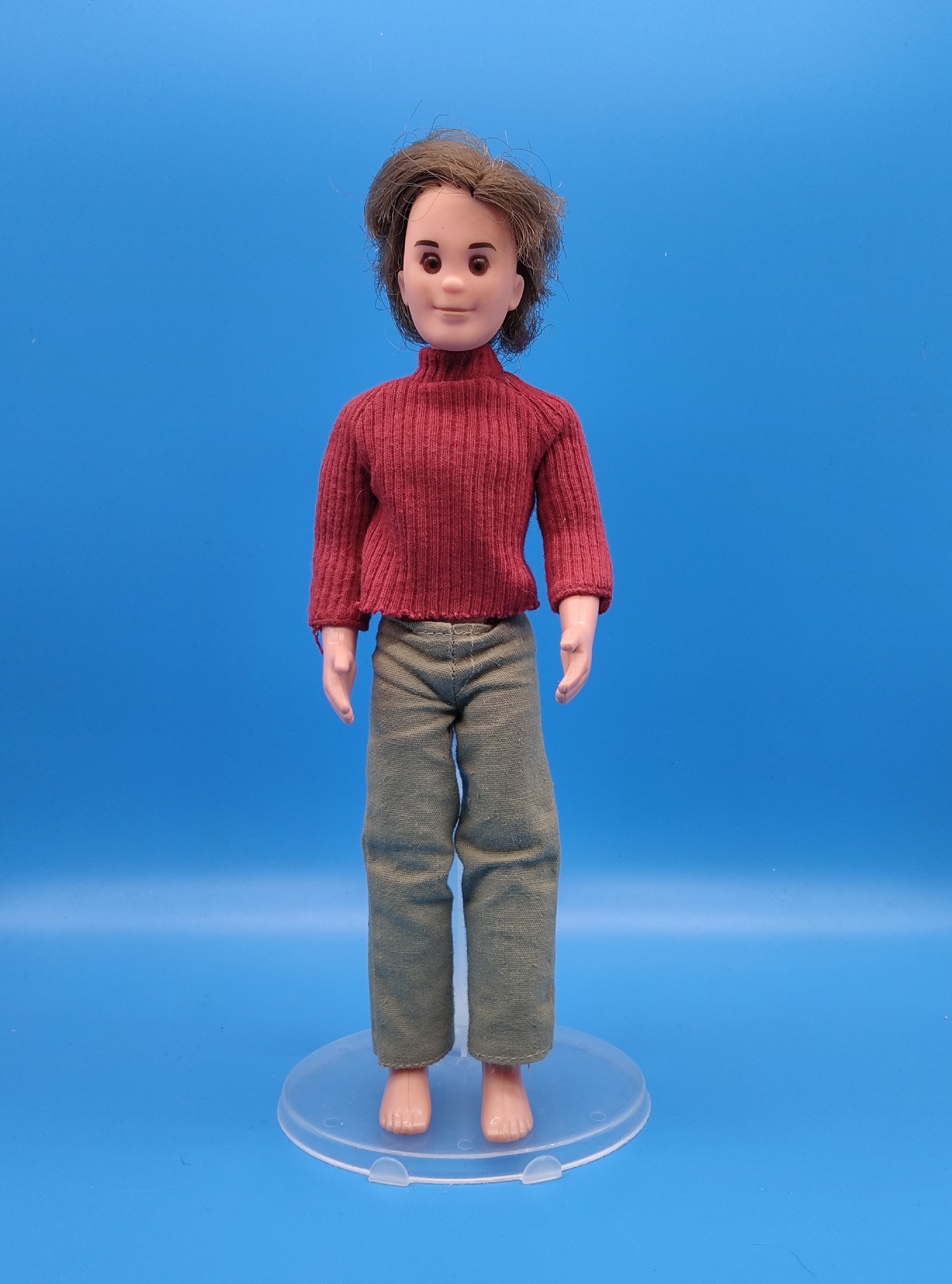 Vintage 1973 Mattel Sunshine Family - Steve father doll with clothes Кукла Steve (папа) из линейки Mattel Sunshine Family 1973 года — винтажный персонаж, который представляет собой часть семейной коллекции, выпущенной компанией Mattel в 1973 году. Эта линейка отличалась от традиционных кукол тем, что изображала простую сельскую семью, живущую в гармонии с природой, в отличие от более гламурных образов вроде Барби.